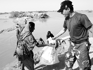 9月18日,在巴基斯坦信德省讷瓦布沙阿,救援人员向灾民发放救援物资。据巴基斯坦国家灾难管理局17日公布的数据显示,巴基斯坦南部近期季风性强降雨所导致的洪水已经造成将近300人死亡,受灾人数超过600万。 新华社发
