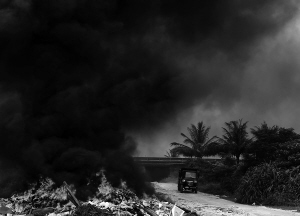 9月20日上午,海文高速公路9公里海口桂林洋高速路出口处,一个穿越高速公路的地下涵洞旁,一堆被点燃的垃圾冒出滚滚浓烟,并散发出刺鼻的异味,令过往行人及车辆苦不堪言。记者在现场看到,燃烧的是一大堆废弃纤维袋、塑料制品,甚至还有医疗垃圾。现场有被推土机掩埋过的痕迹。 本报记者 古月 摄