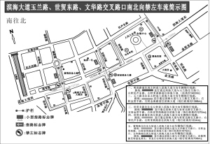 ■文华路南往西左转进入滨海大道方向的机动车辆,现可直行通过滨海大道与文华路交叉路口,沿紫荆路至转盘处掉头,再直行右转进入滨海大道。 (文刚 辑)