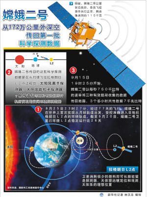8月25日23时27分,经过77天的飞行,嫦娥二号在世界上首次实现从月球轨道出发,受控准确进入日地拉格朗日L2点的环绕轨道。截至9月20日,嫦娥二号卫星已环绕L2点稳定运行近26天。