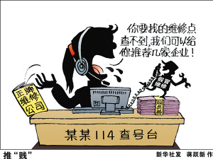 上海市消费者权益保护委员会近期接到投诉:俞先生根据114查号台提供的“海尔特约维修部”电话,找到维修人员,结果后者三次上门更换冰箱风扇都没修好。俞先生起了疑心,查证之后发现对方原来是“李鬼”。