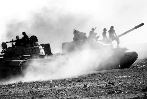 | 9月21日,利比亚执政当局武装人员在拜尼沃利德外围驾驶坦克行进。 新华社/法新