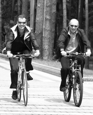 ①在俄罗斯高尔基,俄罗斯总统梅德韦杰夫骑自行车。