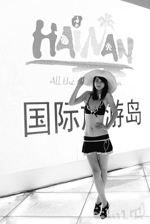 | 9月21日,海南展馆内身着比基尼模特,吸引了众多目光。 |