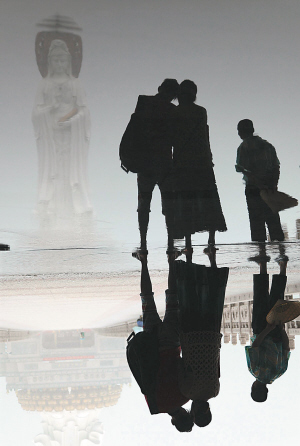 9月20日,三亚突降暴雨。在南山景区海上观音广场处,游人在屋檐下边躲雨,边欣赏雨中观音美景,人们和地面的雨水倒影相映,俨然是一幅有趣的写意画。 特约记者 陈文武 本报记者 苏建强 摄