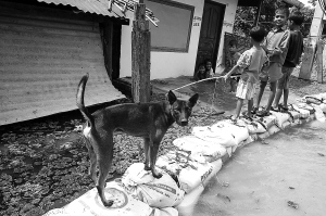 9月26日,在柬埔寨首都金边,几名儿童站在家门外用于防堵洪水的沙包上。 柬埔寨首相、国家救灾委员会主席洪森26日在金边宣布,一个多月来的洪涝灾害给柬埔寨人民生命财产造成严重损失。截至目前,洪灾至少已造成97人死亡。 新华社/路透