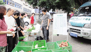 | 九月二十六日,福州市民在停在桂香新村外的“菜篮子”社区平价直通车前购买蔬菜。 新华社记者 林善传 摄 |