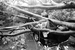 | ↓海口金牛路树木被大风连根拔起,砸坏路边的三辆汽车。 本报记者 古月 摄 |