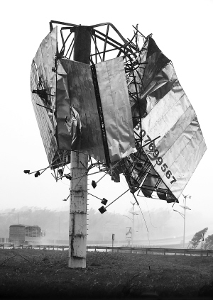 | ↑ 环岛高速路边的广告牌,被风刮得一团糟。 本报记者 李英挺 摄 |