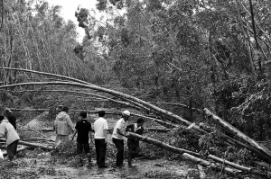 下午5时多,村庄里积水很多,四处狼藉,碗口大的木麻黄被风折断,地上满是刮掉的残枝败叶。