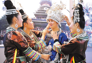10月1日,一位苗族姑娘(右二)在上海三民民俗博物馆展示精美的苗族头饰。当日,黔东南侗族精品服饰展和侗族大歌表演在上海三民民俗博物馆举行。黔东南侗族服饰精品展上展出的苗族华丽服饰和头饰吸引了众多市民参观;而“多声部、无指挥、无伴奏”的侗族大歌表演则为观众展现了非凡的合唱艺术魅力。 新华社发