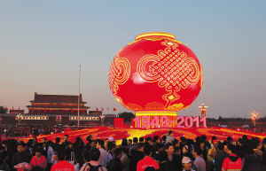 10月1日,游人在北京天安门广场观赏夜幕下的巨型灯笼。当日,北京国庆节夜色璀璨,大红灯笼、花坛、各色灯火把京城装扮得分外美丽,充满了浓郁的节日喜庆气氛。 新华社发