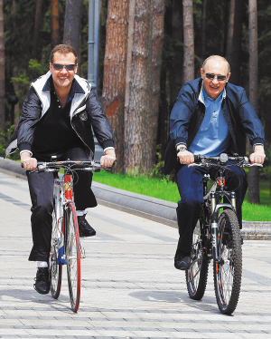 | 梅德韦杰夫(左)和普京结伴骑自行车。 新华社/路透 |
