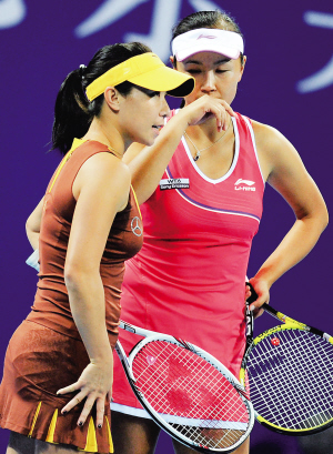 10月2日,在中国网球公开赛女子双打第一轮的比赛中,中国选手彭帅(右)/郑洁以2:0击败中国选手张帅/日本选手伊达公子,顺利晋级。 新华社发