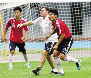 国足今天的训练内容安排得非常丰富,除了每次训练必须强化的边路传中、射门训练之外,卡马乔还专门安排了定位球的训练以及全场的分组对抗。值得一提的是,无论是在定位球训练,还是分组对抗中,卡马乔以及他的助手们都亲自上阵,一方面是为了给队员们进行示范,一方面也是在球队人数不够的情况下凑够替补阵容。