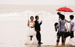 10月3日,三亚湾边,一对恋人在拍摄婚纱照。 本报记者 宋国强 摄