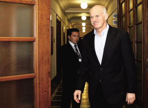 10月2日,在希腊雅典,希腊总理帕潘德里欧(前)抵达议会参加内阁会议。 当晚,希腊内阁决定在今年年底前裁减3万名国企员工,以便节省约3亿欧元的开支。这3万名员工在被裁减后的12个月内获得原收入的60%,此后将失业。这是希政府实施“劳动力储备计划”、减少公有部门员工数量的第一步。 新华社/路透