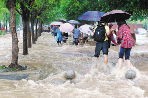 10月5日,海口市坡巷路积水严重,行人趟水而过。 本报记者 苏晓杰 摄