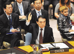| 十月四日,在纽约联合国总部,中国常驻联合国代表李保东在表决中投否决票。 新华社记者 申宏 摄 |