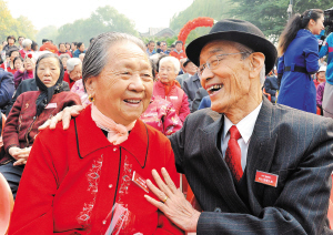 10月5日,在济南大明湖景区,89岁老人程远涛(右)和妻子姜绍云在金婚大典上笑谈婚姻历程里的趣事。 当日,由山东省委老干部局和山东广播电视报联合主办的2011金婚大典在济南市大明湖景区举行,来自山东全省的99对金婚老人参加了此次活动。 新华社发