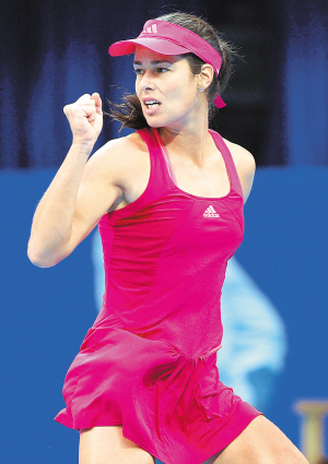 10月5日,伊万诺维奇在比赛中庆祝得分。当日,在中国网球公开赛女子单打第三轮比赛中,塞尔维亚选手伊万诺维奇以2比0战胜俄罗斯选手兹沃娜列娃,晋级下一轮。 新华社记者 孟永民 摄