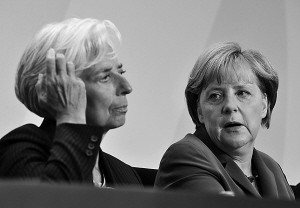 10月6日,以国际货币体系改革和经济发展为主要议题的高级别会议在德国柏林举行,德国总理默克尔(右)、国际货币基金组织总裁拉加德、世界银行行长佐利克和经济合作与发展组织秘书长古里亚等出席会议。 新华社记者 马宁 摄