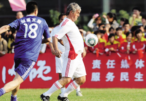 10月7日,前中国国家男子足球队主教练米卢故地重游,在沈阳和他当年的“战友”、弟子共同庆祝中国足球队世界杯出线十周年,并祝愿现任国足主教练卡马乔率领中国队取得2014年巴西世界杯入场券。由米卢率领的老国家队与1990年辽足亚俱杯冠军元老队进行的表演赛是庆祝活动的最高潮,最终老国家队6:5获胜。图为米卢(右)在表演赛中拼抢。 新华社发
