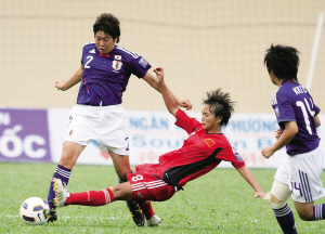 亚洲青年女子足球锦标赛 中国队首场平日本 7日,中国队在2011年亚洲青年女子足球锦标赛首场比赛中以1:1战平日本队。图为中国队球员王霜(右)在比赛中拼抢。 新华社发