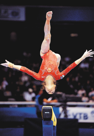 | 8日,中国选手姚金男在女子团体资格赛平衡木比赛中。