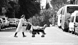 10月8日,一位母亲用童车推着孩子横穿马路。 当日,耶路撒冷的街道上不见了往日穿梭的车流。从7日日落到8日黄昏是今年的犹太教节日赎罪日,也是以色列一年当中唯一的无车日。赎罪日期间,除警车和救护车等执勤车辆外,其他机动车不得出行。 新华社记者 尹栋逊 摄