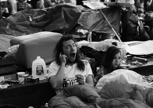 | 在曼哈顿的祖科蒂公园,两名抗议者面露疲惫。 新华社发 |
