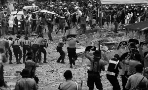 左下图:10月10日,在印度尼西亚巴布亚省的提米卡,警察朝空中开枪以驱散人群。当天,来自当地一家矿业公司的数千名矿工举行游行,一名抗议者在抗议中死亡。 新华社/路透