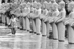 10月10日,居民穿过被洪水淹没的街道。近两个月来洪水引发的灾害导致柬埔寨全国207人死亡,受灾人口约120万。 新华社发(披隆 摄)