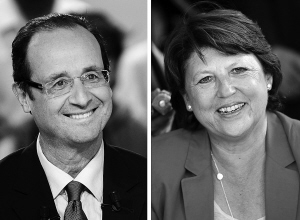 10月9日,法国最大反对党社会党为2012年总统选举准备的党内候选人初选第一轮投票结束,进入第二轮。这是社会党前总书记弗朗索瓦·奥朗德(左)与现总书记玛蒂娜·奥布里的拼版照片。 新华社/法新
