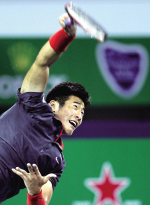 | 10月10日,中国选手李喆在上海网球大师赛男单首轮比赛中,不敌西班牙选手沃达斯科。图为李喆在比赛中发球。