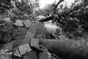 | 9月29日下午,金牛路西侧10多棵大树被强风连根拔起。