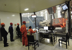 10月10日,在洛阳中信重工重型锻造工部,技术人员正在工作室操作18500吨油压机锻造438吨特大型钢锭。 当日,世界最大的18500吨油压机在洛阳中信重工重型锻造工部完成“大考”,成功锻造438吨特大型钢锭,标志着我国大型自由锻件的锻造能力达到世界水平。 新华社发(李博 摄)