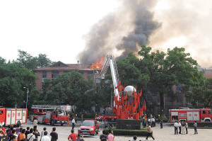 10月10日,在中南大学理学楼火灾现场,消防人员在全力扑救大火。 当日中午12时50分左右,中南大学修建于上个世纪60年代的理学楼实验室突发火灾,过火面积约1千平方米。当地消防部门接警后紧急出动救援,下午3时火势得到控制,目前尚无人员伤亡报告。 新华社发(廖玉荣 摄)