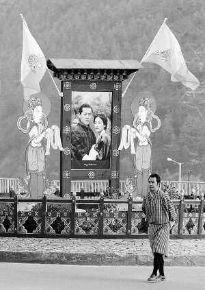 世界上最年轻的国王 不丹国王将大婚 10月11日,在不丹首都廷布,一名身穿传统服装的男子从不丹国王吉格梅·凯萨尔·纳姆耶尔·旺楚克与未婚妻的合影旁边走过。 不丹国王吉格梅·凯萨尔·纳姆耶尔·旺楚克现年31岁,2006年继位,是当今世界上最年轻的国王。他计划于10月15日举行婚礼。 新华社/法新