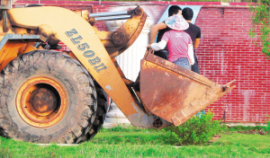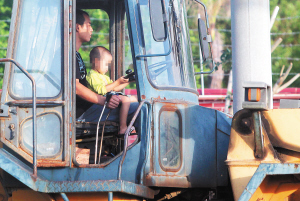 10月12日,海口市琼山大道旁,一名施工人员驾驶装载机时,怀里还抱着一位小孩,并且将方向盘交给小孩操作。更令人惊讶的是,施工结束后,几名施工人员站在铲斗中,摇摇晃晃地离开,让旁人不禁为他们捏把冷汗。 本报记者 李英挺 摄影报道