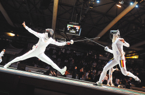 10月13日,在意大利卡塔尼亚进行的2011年世界击剑锦标赛女子重剑个人赛中,中国选手孙玉洁和李娜打入四强。图为孙玉洁(左)击败罗马尼亚选手亚历山德鲁。 新华社发