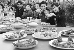 10月15日,邻居们在一起准备分享邻家菜肴。 当日,郑州市天伦星钻小区开展邻里和睦百家宴“邻居节”活动,众多居民将自家做的拿手菜拿到活动现场参加比赛,并同邻居一起分享。活动把居民们聚集在一起,增进情感,倡导文明,营造和谐、融洽、互助的邻里关系。 新华社记者 朱祥 摄