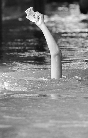 | 在泰国首都曼谷附近暖武里府,一名在洪水中游泳的男孩高举钞票,防止弄湿。