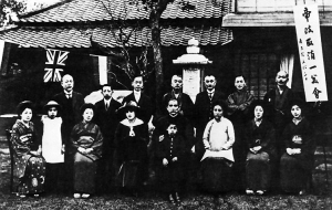 | 袁世凯被迫于1916年3月22日取消帝制。4月9日,孙中山(前排右四)、廖仲恺(后排左二)、宋庆龄(前排左四)、何香凝(前排右三)等在日本举行“帝政取消一笑会”。