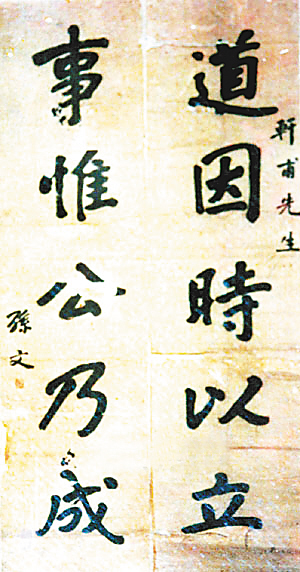 据央视《寻宝》栏目今夏在海口的鉴定,认为孙中山先生亲笔题赠给海南人林树椿的书法作品———“道因时以立,事惟公乃成”,是我省目前发现的唯一一件流传有序的孙中山先生墨宝,与孙中山先生广为人知的“天下为公”相比,这副孙先生的亲笔遗墨却鲜为人知,有着不同寻常的历史意义。对联第一次公诸于世是在2003年初的《海南日报》“似水流年”专栏。