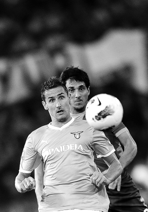 10月17日,在意甲第7轮比赛中,拉齐奥队以2:1战胜罗马队。图为拉齐奥队球员克洛泽(前)在比赛中拼抢。 新华社发
