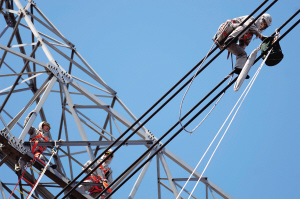 10月17日,山东省德州平原县王庙镇楼庄村头,电力作业人员登上56米高的高压铁塔,完成了±660千伏电压等级带电作业。这是世界上首次在±660千伏高压线路上进行高空带电作业。