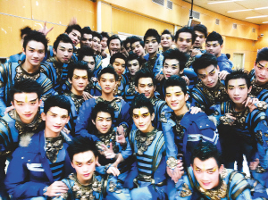 | ←嘉积中学男子舞蹈团成员在演出间隙合影。