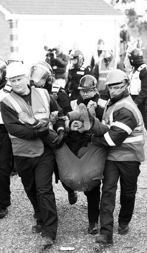 10月19日,在英国巴西尔登附近的戴尔农场,一名抗议者被移走。 英国警方19日开始清理国内最大的流浪者非法居住区“戴尔农场”。部分居住者及支持者与警方发生冲突。戴尔农场位于首都伦敦以东大约50公里,住着大约400名流浪者。戴尔农场“非法”争议自2001年开始,英国一家法院上周裁定予以清理。 新华社/法新