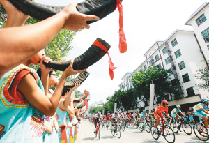 | 10月20日,车手骑行经过保亭县城,当地用极具民族特色的方式欢迎各国选手。 本报记者 宋国强 摄